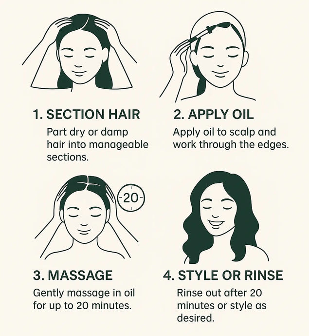 Massage a small amount into scalp and edges 3–4 times per week. Leave in overnight or at least 20 minutes before rinsing. It can also be used as a daily styling oil to seal moisture and add shine.